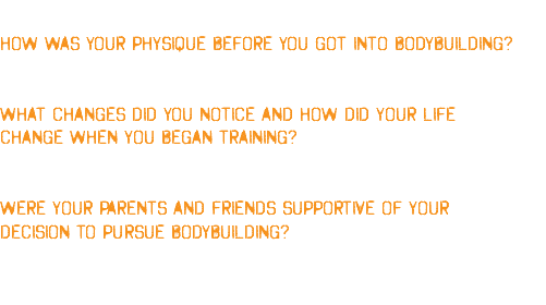 QUESTIONS AND ANSWERS HOW WAS YOUR PHYSIQUE BEFORE YOU GOT INTO BODYBUILDING? I was quite a well-built guy from the age of fifteen. When I was at school, I was always the biggest guy in my year. WHAT CHANGES DID YOU NOTICE AND HOW DID YOUR LIFE CHANGE WHEN YOU BEGAN TRAINING? There was a big change in the way people saw me. I gained a lot of respect and confidence in myself. WERE YOUR PARENTS AND FRIENDS SUPPORTIVE OF YOUR DECISION TO PURSUE BODYBUILDING? My parents were more in favour of rugby than bodybuilding, but they still always supported me.